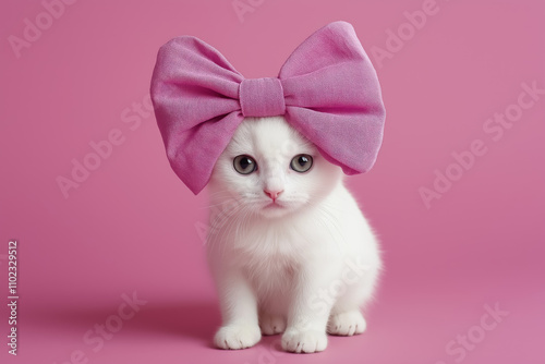 © Klay, Obraz premium cute white cat wearing a big oversized mauve bow on its head, perfect for pet fashion and adorable animal portraits