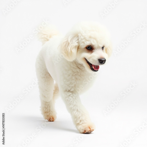 © Sofikul, Obraz premium Cute white dog walking indoors during daylight in a bright and cheerful setting