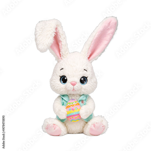 Obraz premium Cute white Easter bunny holding colorful egg.