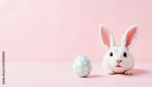 Obraz premium Cute white Easter bunny with painted egg on pink background