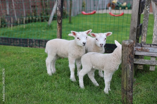 © New Africa, Obraz premium Cute white lambs near fence in farmyard