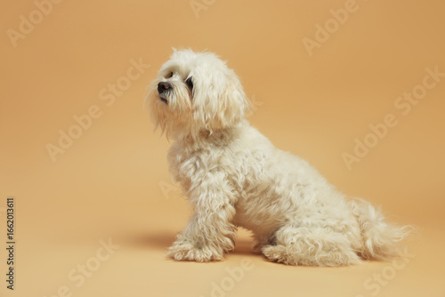 Fototapeta premium Cute white Maltese dog on beige background