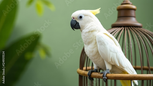© Ksu, Fototapeta premium Cute white parrot sitting on a wooden cage on a soft green background, copy space