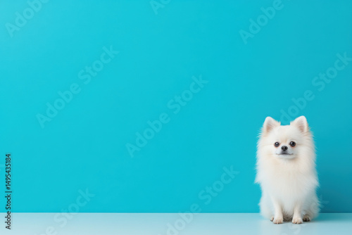 © Papukos, Fototapeta premium Cute white pomeranian dog sitting on white floor against vivid blue background