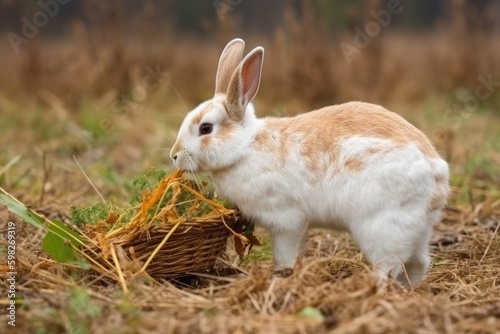 Fototapeta premium cute white rabbit happily munching on a carrot in a sunny green field....
