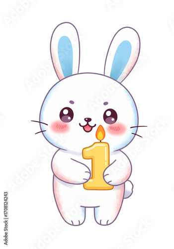 Obraz premium Cute White Rabbit Holding Yellow Number One Candle on Transparent Background