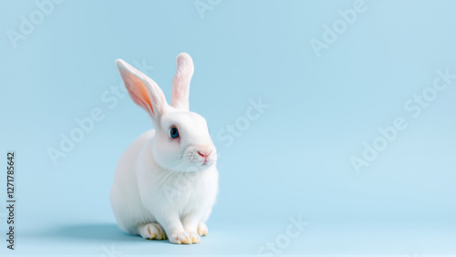 Obraz premium Cute white rabbit on isolated blue background