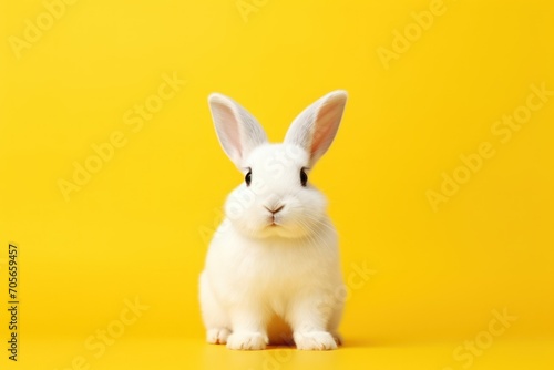 © Hitam Putih, Fototapeta premium Cute white rabbit on yellow background with copy space for text