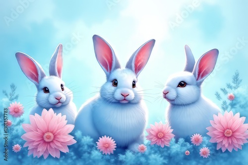 Obraz premium Cute White Rabbits Among Pink Flowers in a Pastel Sky Background Image