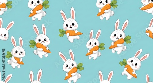 © Merry, Naklejka premium Cute White Rabbits Holding Carrots Cartoon Seamless Pattern.
