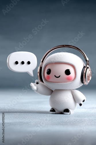 Obraz premium Cute White Robot Character Wea Headphones Standing on Surface with Speech Bubble in Studio Light Visual Style for Technology Concepts and Future Automation Themes