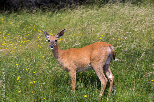 Obraz premium Cute white-tailed doe standing in wildflowers with mouth open and tongue hanging out staring with startled look in Port-Menier, Anticosti, Quebec, Canada