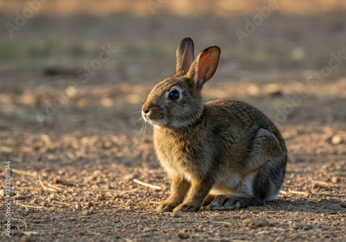 Fototapeta premium Cute Wild Rabbit Sitting on Dry Ground at Sunset