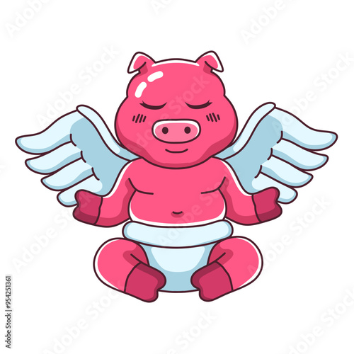 © blackwrap_byartku, Naklejka premium cute winged pig is meditating looking for peace.cartoon illustration on white background