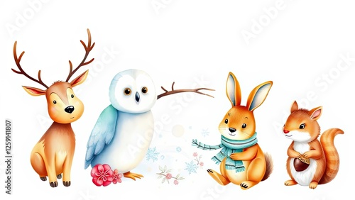 © Ahingska, Naklejka premium Cute Winter Animals Deer Owl Bunny Squirrel Illustration