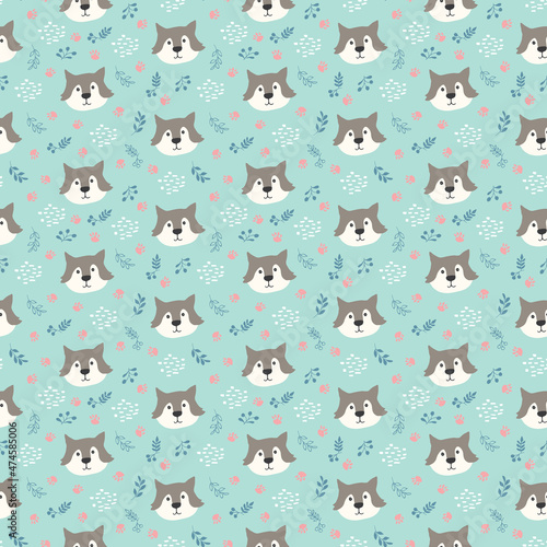 © saint_antonio, Obraz premium Cute wolf Seamless pattern. Cartoon Animals in forest background. Vector illustration