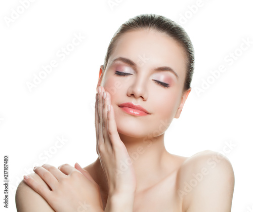 © artmim, Fototapeta premium Cute woman face isolated on white background. Beautiful female model portrait