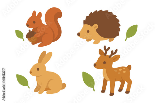 © Susann, Naklejka premium Cute woodland animals icon set. Adorable forest creatures collection with squirrel, hedgehog, rabbit, deer. Flat cartoon vector illustration isolated for kids design.