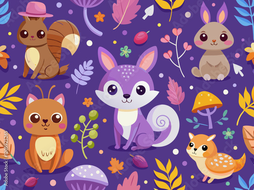 © Najmul Design Hub, Naklejka premium Cute Woodland Animals Pattern on Purple Background