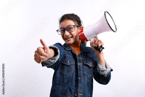 © ArvStd, Naklejka premium Cute 10 year old asian girl holding megaphone isolated on white background smiling and giving thumbs up