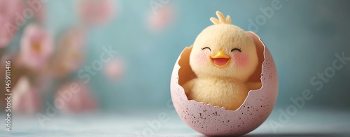 © Mai, Obraz premium Cute yellow chick hatching from pink egg, symbolizing new beginnings and innocence in a soft, pastel background.