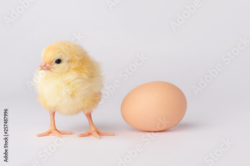 © Vladimir, Fototapeta premium Cute yellow chicken with egg isolated on a gray background