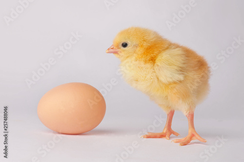 © Vladimir, Fototapeta premium Cute yellow chicken with egg isolated on a gray background