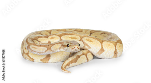 © Nynke, Obraz premium Cute yellowish ball python, curled up. Head on body, looking bedise camra. Isolated on a white background.