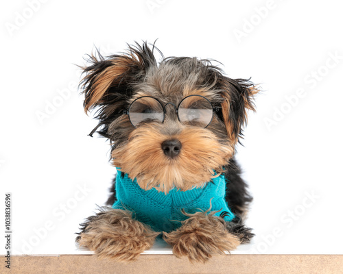 © Viorel Sima, Fototapeta premium cute yorkie dog with round eyeglasses sitting at the desk and looking forward