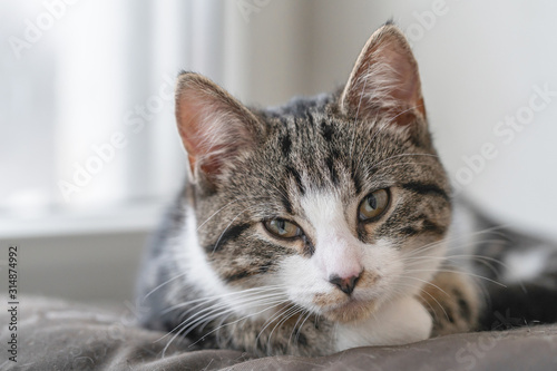 © Dmitriy Popov, Obraz premium Cute young cat basking in the sun on a windowsill