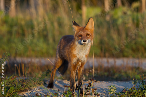 Fototapeta premium Cute young fox cub on the grass background. One. Evening light. Wild nature. Animals.