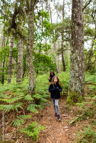 Naklejka premium cute young girl and her mom walking in a beautiful forest