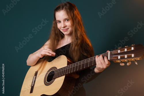 © ketrin, Obraz premium cute young girl playing the guitar on the background.