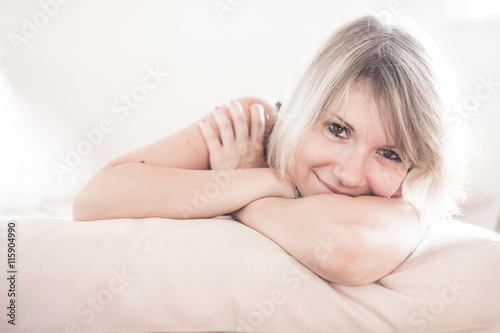 © bluebeat76, Fototapeta premium Cute young girl relaxing on couch at home. Hi key Softfocus Imag