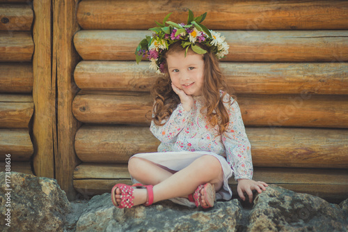 © TwinkleStudio, Obraz premium Cute young girl with brown eyes brunnette plait hair and pink cheek wearing white dress shirt and posing close to wooden house fence wagon looking to camera with wreath of flowers on head