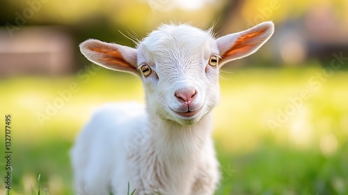 © Generative AI, Obraz premium Cute Young Goat Smiling Joyfully While Grazing in a Lush Green Meadow : Generative AI
