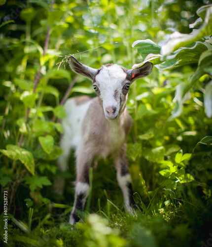 © Farinoza, Fototapeta premium Cute young grey goatling in a garden
