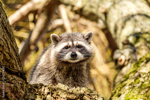 Fototapeta premium cute young raccoon resting on moss covered tree trunk in the morning staring...
