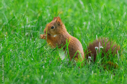 Fototapeta premium cute young squirrel playing on green meadow at park