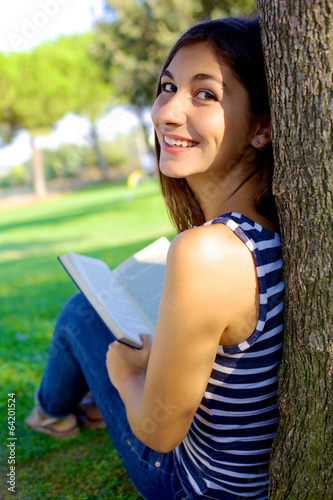 © fmarsicano, Naklejka premium Cute young woman reading book in park in the summer