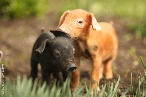 © Bogdan, Fototapeta premium cutie and funny young pig is standing on the green grass. Happy piglet on the meadow, small piglet in the farm posing on camera on family farm. Regular day on the farm