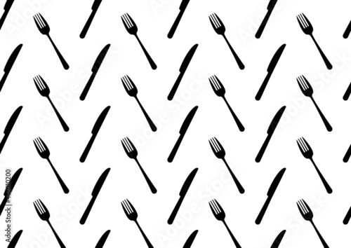 © Irina, Naklejka premium Cutlery black silhouette vector seamless pattern. Fork and knife elements endless texture. Flat simple design.