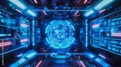 Obraz premium Cutting-Edge Control Room with Central Holographic Interface