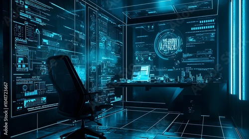 © LULU.Stock journey, Naklejka premium Cutting edge home office setup with sleek minimalist design and interactive holographic displays presenting real time data and information for enhanced productivity and efficiency