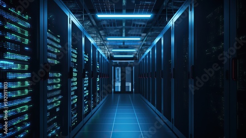 © Aruni, Obraz premium Cutting-Edge Technology in Modern Bright Server Room Data Center Environment Generative AI