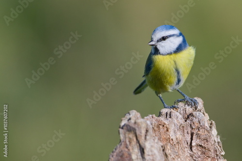 © czjonyyy, Fototapeta premium Cyanistes caeruleus aka blue tit on dry tree. Isolated on clear blurred background. Close-up portrait.