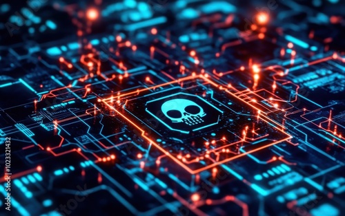 Fototapeta premium Cyber crime scene with a hacker attack, futuristic interface showing breached security systems, data protection warning, internet safety concept