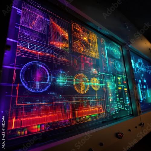 Obraz premium Cyber dashboard displaying complex data with vibrant lighting effects,...