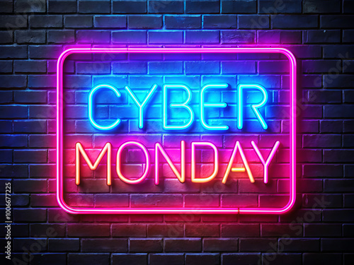 Obraz premium Cyber Monday neon sign glowing brightly against dark brick wall, creating vibrant and modern atmosphere. Perfect for promotions and sales events