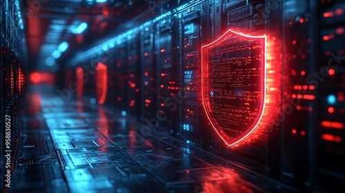 Obraz premium Cyber Security Concept - Glowing Shield Protecting Data Server Farm with Encryption Codes